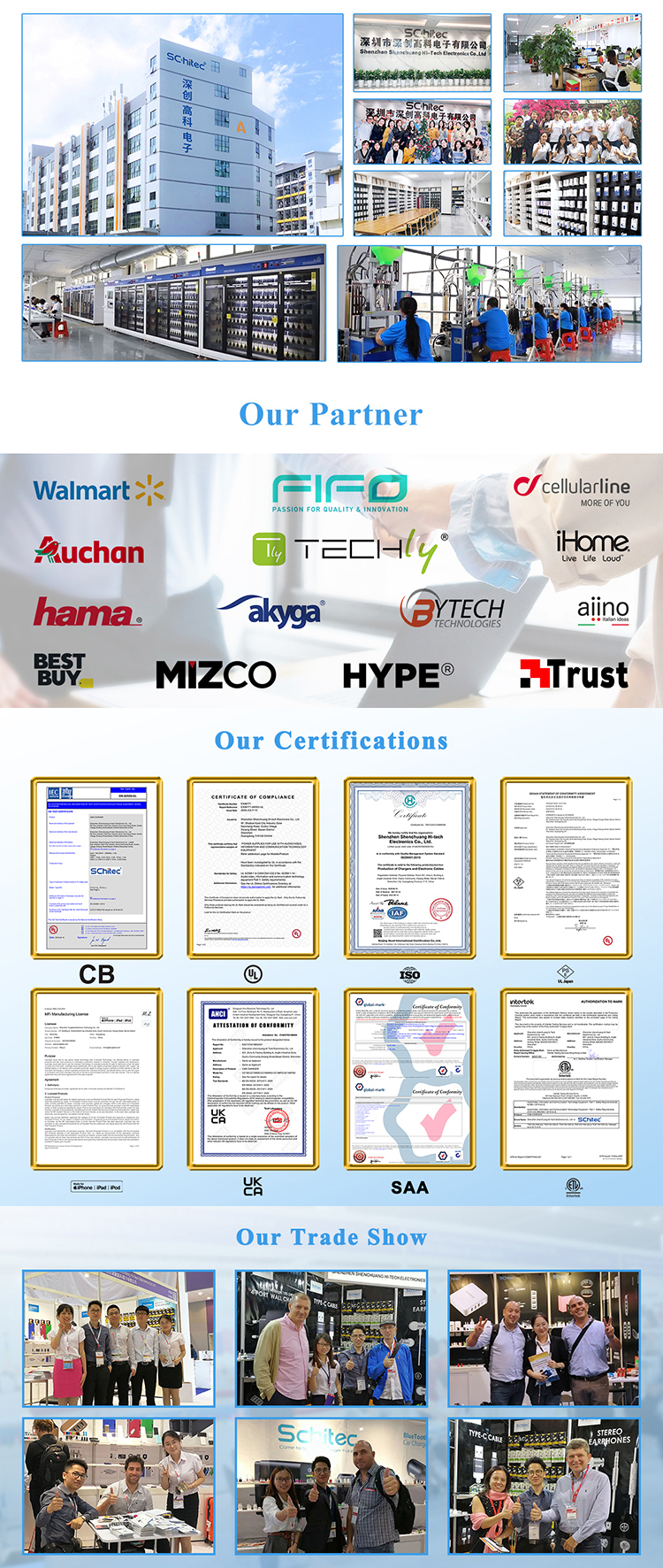 SChitec a fost înființată în 2009. Este un producător de accesorii pentru telefoane, cum ar fi cabluri de încărcare, încărcătoare de mașină și încărcătoare de perete etc. Cu mai mult de un deceniu de experiență, SChitec devine din ce în ce mai puternic și are o experiență bogată în fabricarea OEM. Avem o echipă de cercetare și dezvoltare pentru a dezvolta produse noi. SCchitec este un partener de cooperare de încredere.